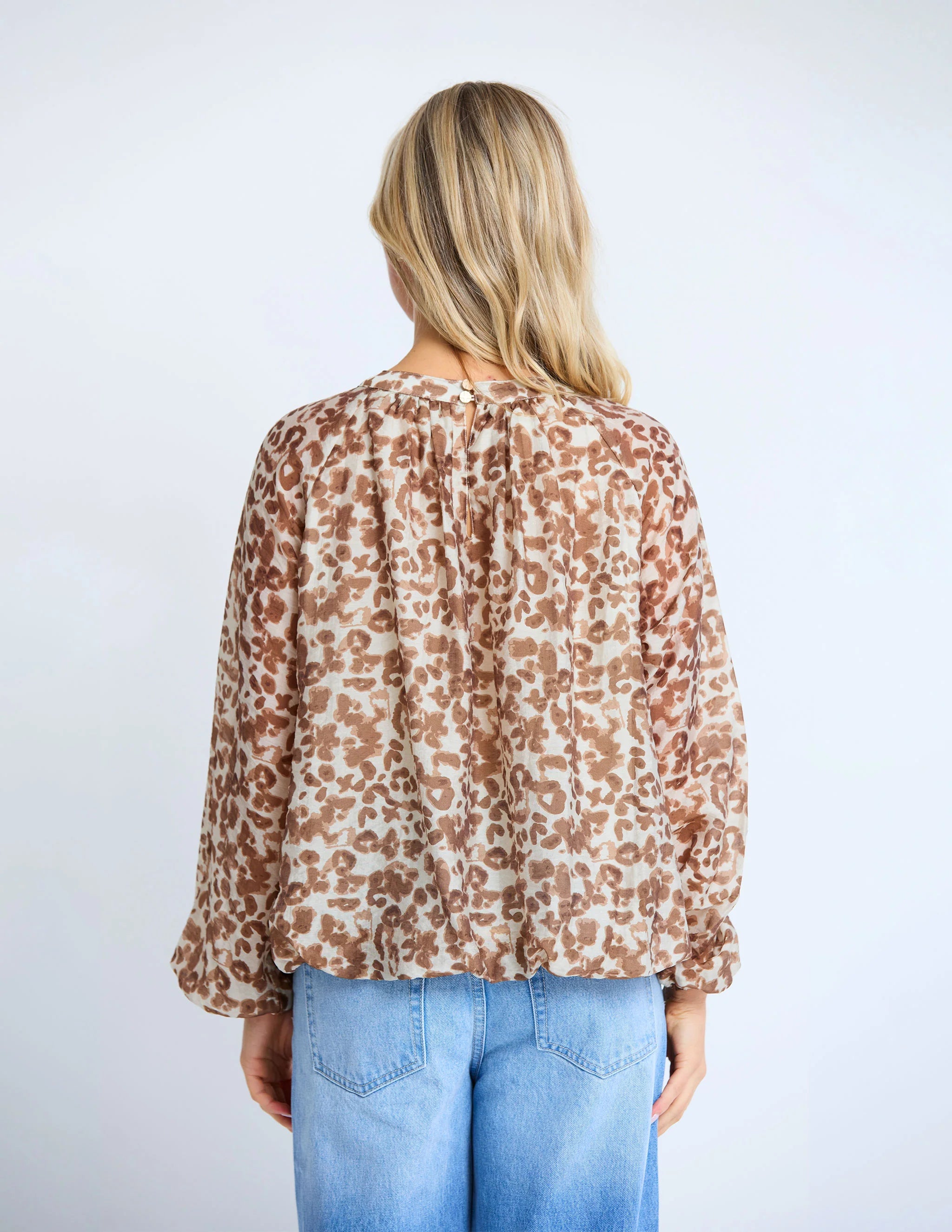 Crew neck raglan sleeve blouse. Full gathering detail around neckline, full sleeves gathered into the cuff and bloused hemline shaping. Fully lined body and sheer sleeves. Keyhole split at back neck with double logo button fastening.
